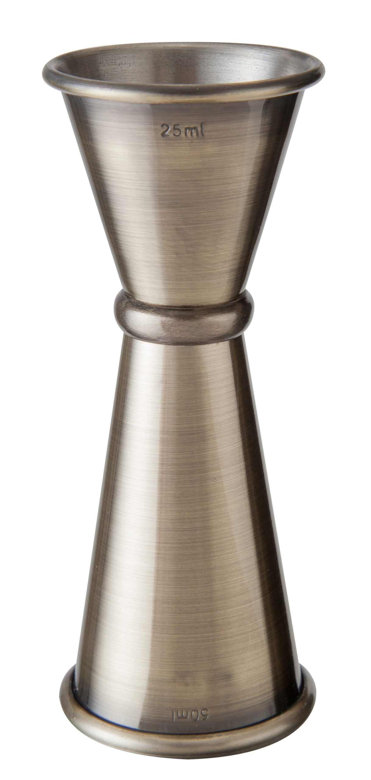 With an opulent style, the antique brass range delivers a unique aesthetic. With a 25 ml and 50ml cup and this banded jigger also has internal markings for 35 ml pours.
