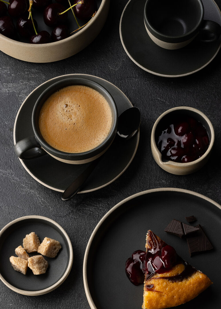 Omega combines contemporary design and a natural mottled outer wall with a dramatic dark interior. A perfect foil for your dish.